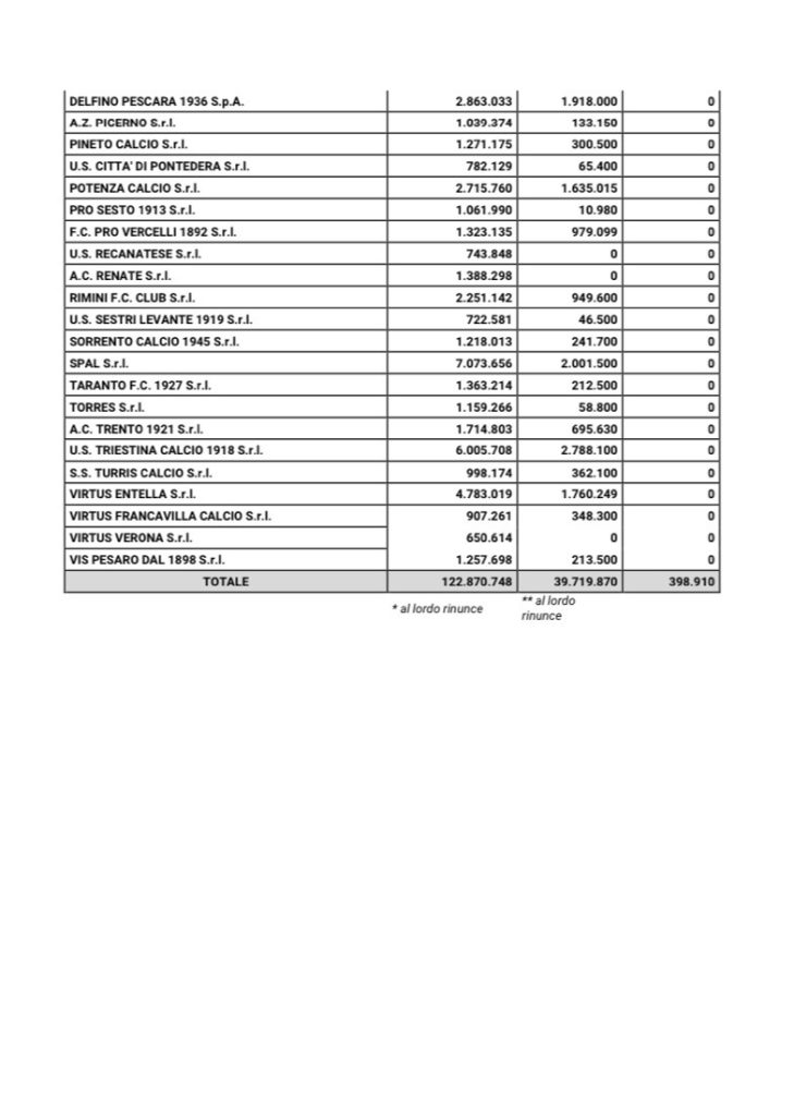 IL MONTE INGAGGI DELLE 60 SQUADRE DI SERIE C