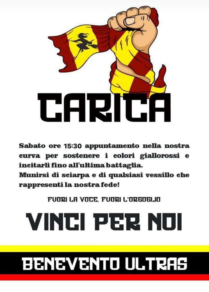 “Sabato ore 15:30 appuntamento nella nostra curva per sostenere i colori giallorossi e incitarli fino all’ultima battaglia. Munirsi di sciarpa e di qualsiasi vessillo che rappresenti la nostra fede. Fuori la voce, fuori l’orgoglio. Vinci per noi”, il messaggio rivolto dalla curva ai sostenitori giallorossi. Un appuntamento che servirĆ a ricompattare ulteriormente l’ambiente e a riaccendere la passione sannita a poche ore dall’inizio degli spareggi, quando la Strega ricomincerĆ la sua corsa promozione.