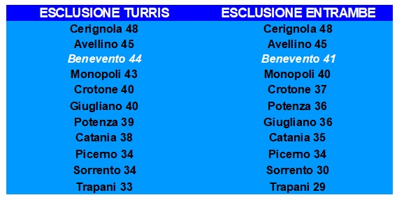 Con l’estromissione del Taranto, ad esempio, al Benevento verrebbero sottratti i 3 punti conquistati a novembre scorso, a differenza dell’Avellino, ko contro i pugliesi in casa, o del Cerignola, sconfitto dagli ionici allo ‘Iacovone’. Perderebbero punti anche Monopoli, Crotone e Potenza (3) insieme a Trapani (4) e Giugliano (6). Discorso simile in caso di esclusione della Turris: il Benevento dovrà rinunciare ai 3 punti conquistati contro i corallini al pari del Crotone, 4 invece quelli persi da Avellino e Potenza, 6 dal Monopoli e dal Cerignola.